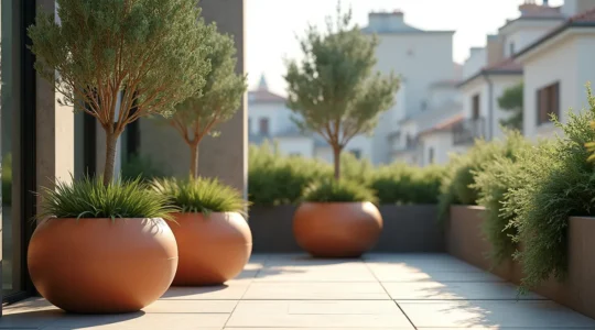 Un grand pot XXL n’est pas un simple contenant, c’est un point focal. L’erreur commune est d’en placer un seul, isolé au milieu de rien. Pour un impact maximal, utilisez-les pour créer du rythme et de la structure : en alignement le long d’une allée, en symétrie de part et d’autre d’une porte, ou en composition de 3 pots de tailles différentes dans un angle. Ils permettent de cultiver des arbustes ou de petits arbres (olivier, érable du Japon, laurier-rose…), apportant de la verticalité à votre décor. Le choix du matériau (terre cuite, béton, fibre, métal) influera sur le style, mais aussi sur des aspects pratiques comme le poids, l’isolation des racines et la résistance au gel sous les climats français.