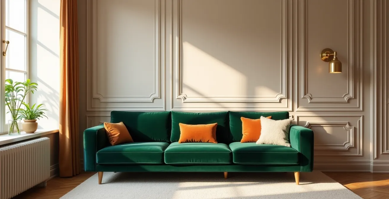 - Ambiance Brutalisme chic : Pour réchauffer la minéralité d’un mur en béton brut (60%), osez un canapé en velours cognac ou vert olive (30%). Le textile doux et coloré créera un contraste sensoriel fort. Ajoutez des touches de laiton brossé (10%) sur les lampes ou les tables d’appoint pour une note de préciosité.
