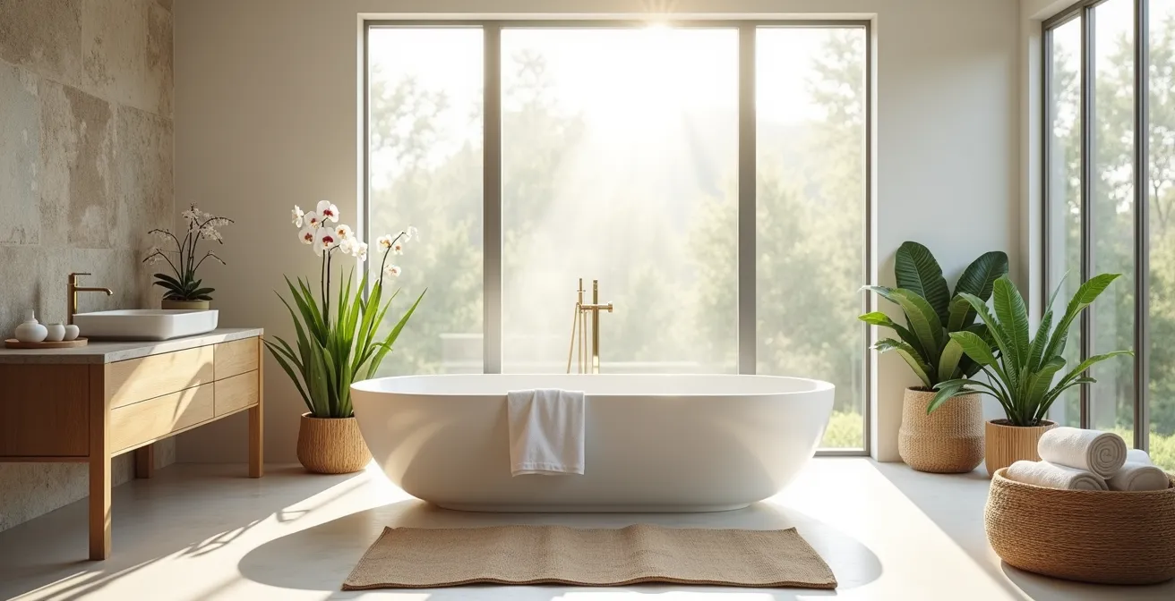 - Pour la touche de vie : Disposez des plantes vertes qui aiment l’humidité pour purifier l’air.