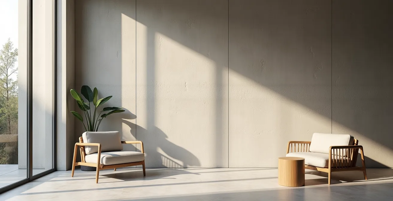 L’enduit béton excelle dans cet exercice. Il n’est jamais parfaitement plat. Sa surface est une carte topographique miniature, faite de nuances et de micro-reliefs qui accrochent le regard et la lumière. Le passage d’une lumière rasante au lever ou au coucher du soleil transforme littéralement le mur, révélant des détails invisibles quelques heures plus tôt. Cette interaction dynamique crée un mur « vivant », qui évolue au fil de la journée et des saisons.