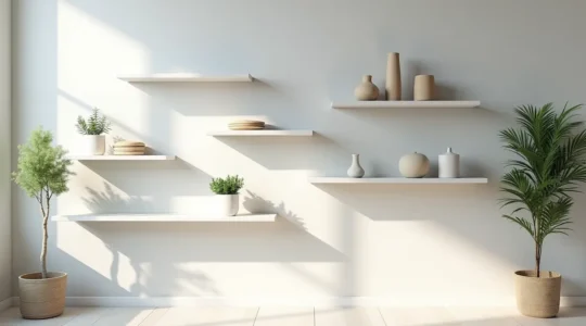 Pour créer une sensation de légèreté et d’épure, rien ne vaut les rangements qui se fondent dans le décor. Les étagères « flottantes », à fixation invisible, semblent léviter contre le mur, offrant un support minimaliste pour vos livres et objets. De même, le mobilier « sans poignées », avec des systèmes d’ouverture par pression (push-pull), contribue à créer des surfaces lisses et continues, notamment dans la cuisine ou le salon, renforçant la sensation de fluidité et d’espace.